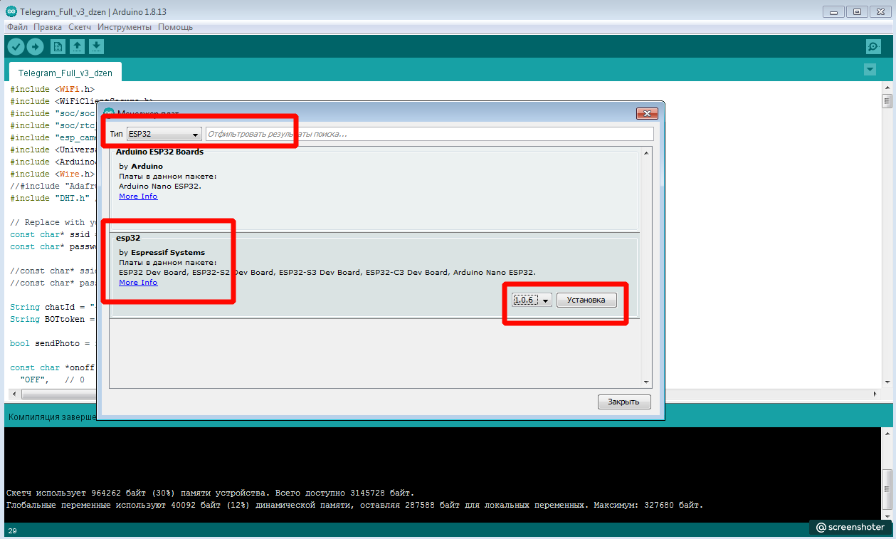 Выбираем esp32 by Espressif System, я взял версию 1.0.6, тут что то скачивается, распаковывается