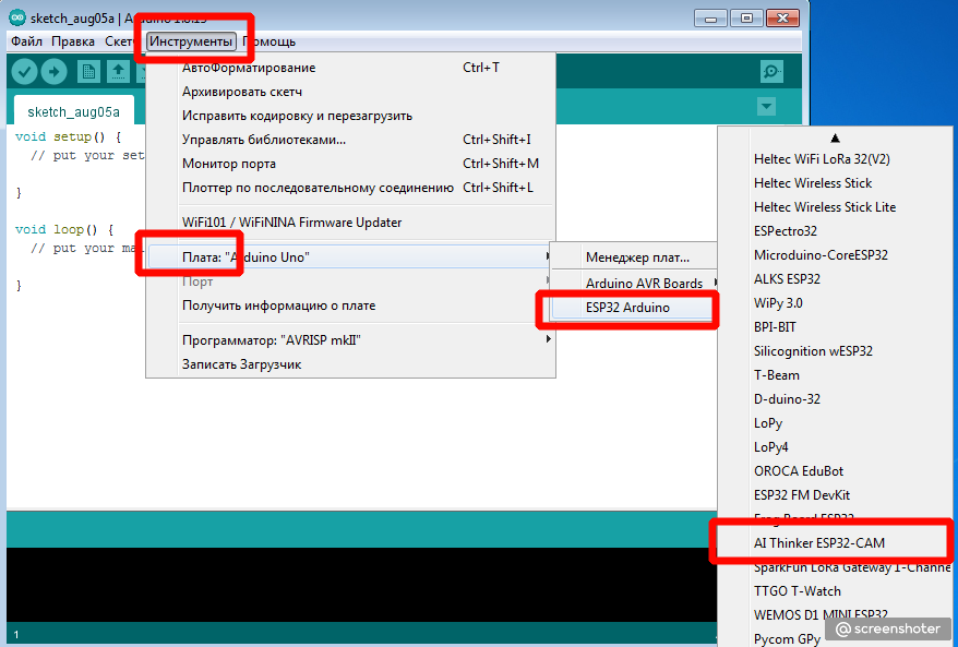 Потом выбираем нужную плату, AI Thinker ESP32-CAM