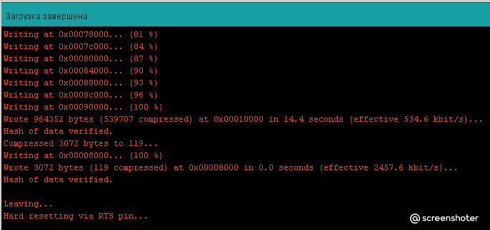 Ждем завершения. Ориентируемся на бегущие проценты, в нижнем чёрном окне. По завершении прошивки там вылезет сообщение. Всё. Прошивка внутри ESP32-CAM.