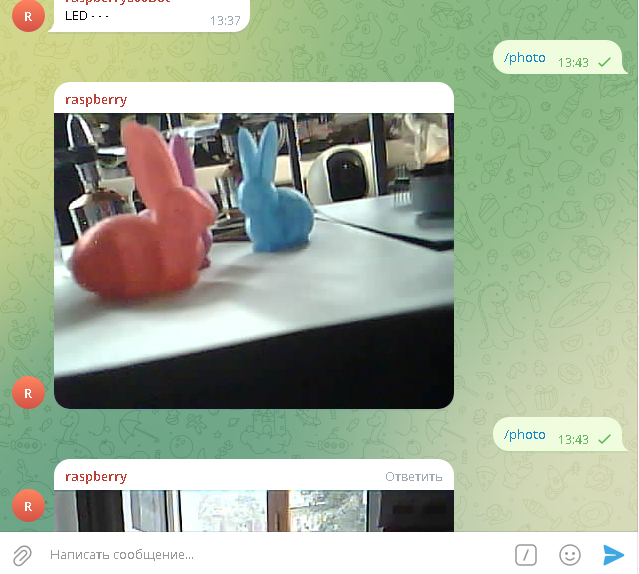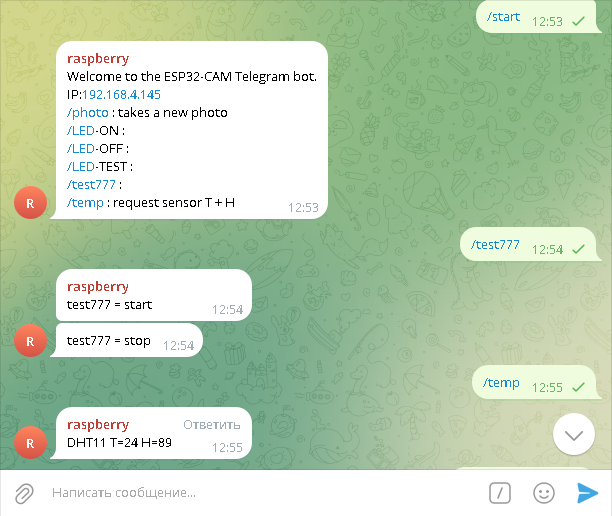 /temp узнать текущую температуру и влажность воздуха. В ответ придет сообщение и фотография. Все очень просто.