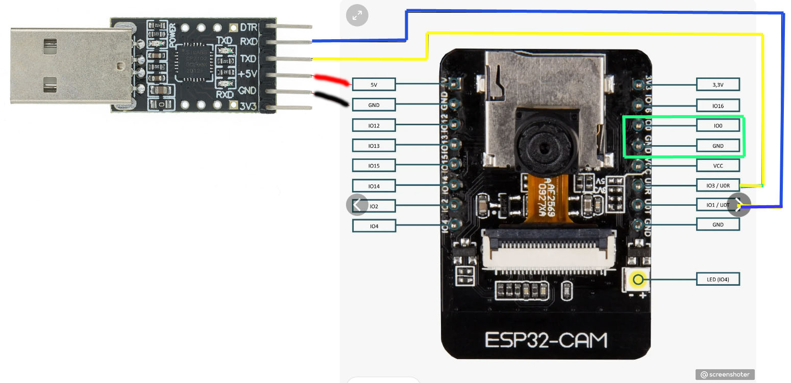 Если просто включить наш модуль ESP32-CAM, то это обычная работа, а если замкнуть контакты IoO и Gnd (на фото я их выделил зелёным квадратом),